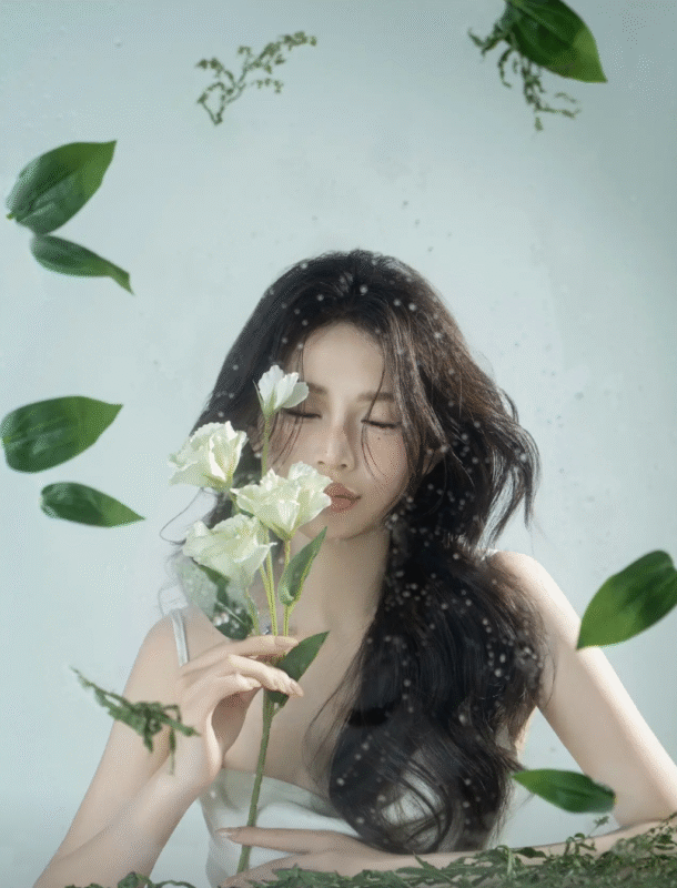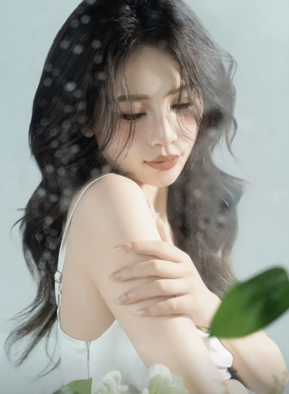 Nàng thơ nhẹ nhàng: ánh sáng mềm, váy trắng, mood yên bình.